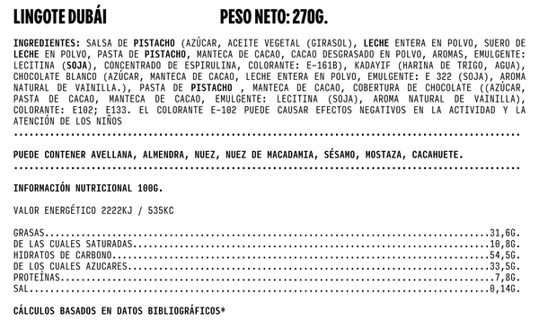 El Lingote Dubái combina pistacho natural machacado con nuestro chocolate de alta calidad. En su interior, capas crujientes de kadayif artesanal envuelven una cremosa salsa de pistacho hecha con ingredientes seleccionados y pasta de pistacho pura.